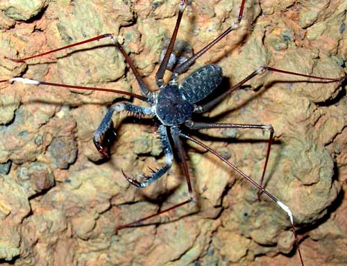 Vinegaroons (Mastigoproctus giganteus), despite their appearance, are not actually scorpions even though they're sometimes called Giant Whiptail Scorpions. They are arachnids who belong to the order Thelyphonida. Although they are not venomous, they defend themselves by spraying a combination of acetic and octanoic acid which smells like particularly foul vinegar. Enough said about their suitability as sleeping bag companions...